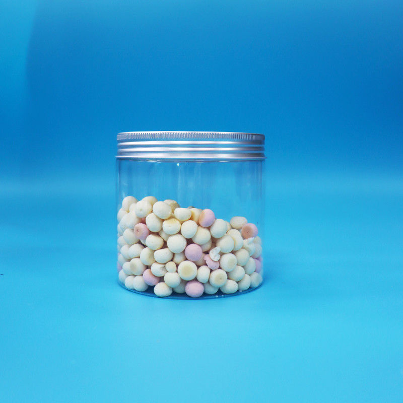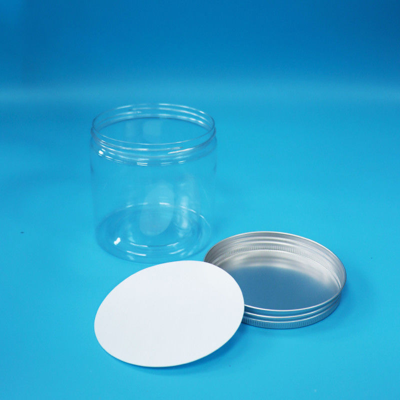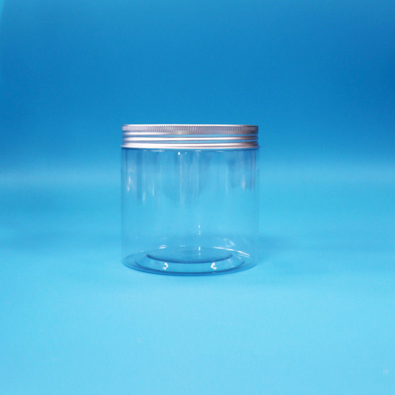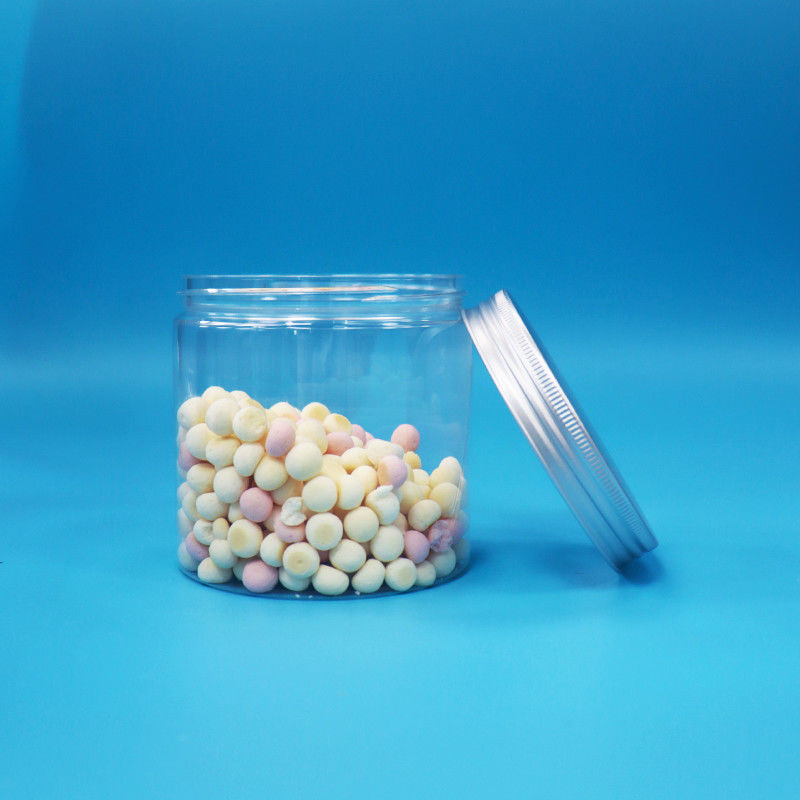 شکل دایره ای دهان وسیع سیلندر شفاف پیت کوکی های پلاستیکی جار کلاه پیچ آلومینیومی